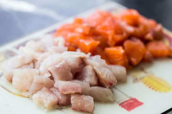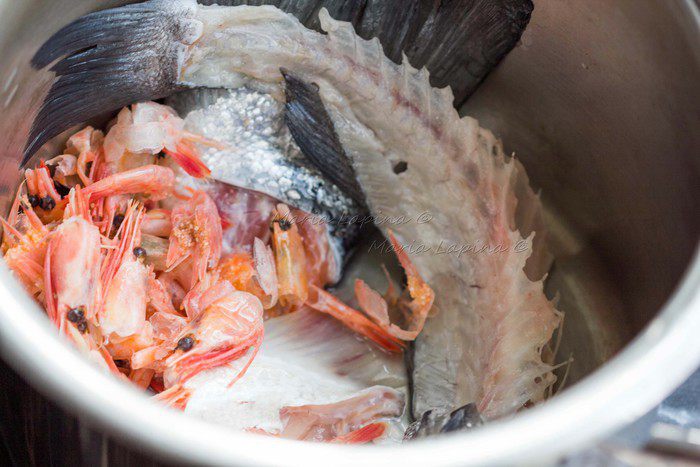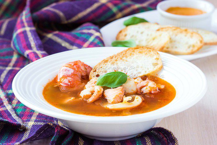 По легенде этот суп был придуман моряками, которые варили его в конце рабочего дня, забросив в кастрюлю всю нераспроданную рыбу и немного овощей. Сейчас же это блюдо подается в изысканных французских ресторанах. Этот суп может быть как очень дорогим, с гребешками, мидиями, омарами, так и не очень с простой морской рыбой, креветками. Сегодня я хочу предложить вам вариант этого супа с сибасом, лососем, креветками и кальмаром.