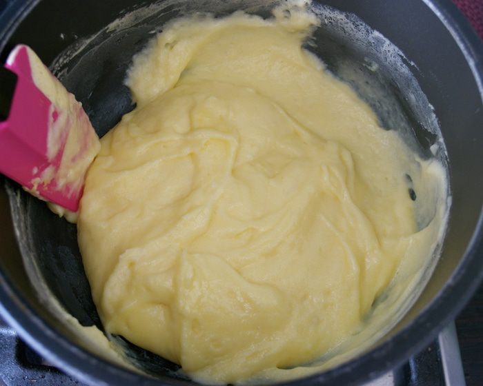 Приготовить заварной крем. Поставить разогреваться молоко. Тем временем смешать желтки с сахаром и мукой. Размещать, чтобы не было комочков. В горячее молоко влить яичную смесь... Не мешать. Как только молоко начнет закипать, энергично размешать, поварить 1 минуту. Снять крем с огня и остудить. (можете приготовить заварной крем привычным для Вас способом).