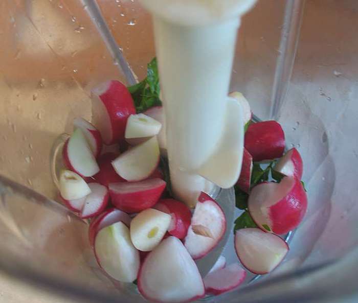Редиску порезать. Редиску, петрушку, чеснок поместить в блендер и прокрутить.