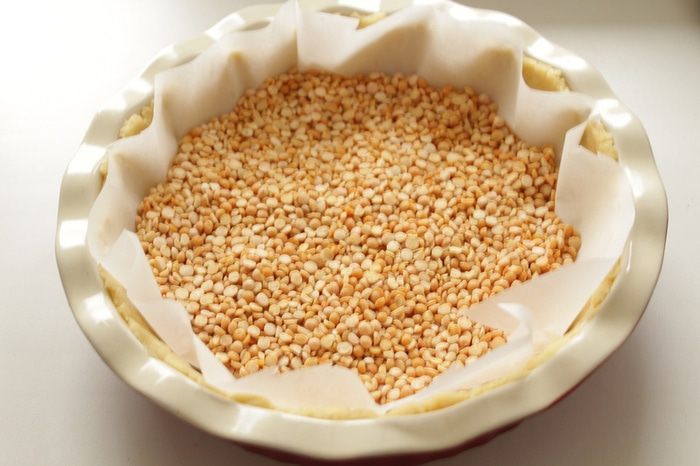 Застелить тесто бумагой для выпечки засыпать любую мелкую крупу, дать постоять в холодильнике еще 30 минут. Выпекать в духовке при 170-180С 10 минут с грузом и 5 минут без него.