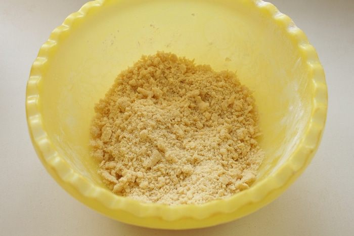Холодное масло измельчить с мукой до состояния мелкой крошки. Добавить сахар, соль и миндальную муку и еще раз измельчить.