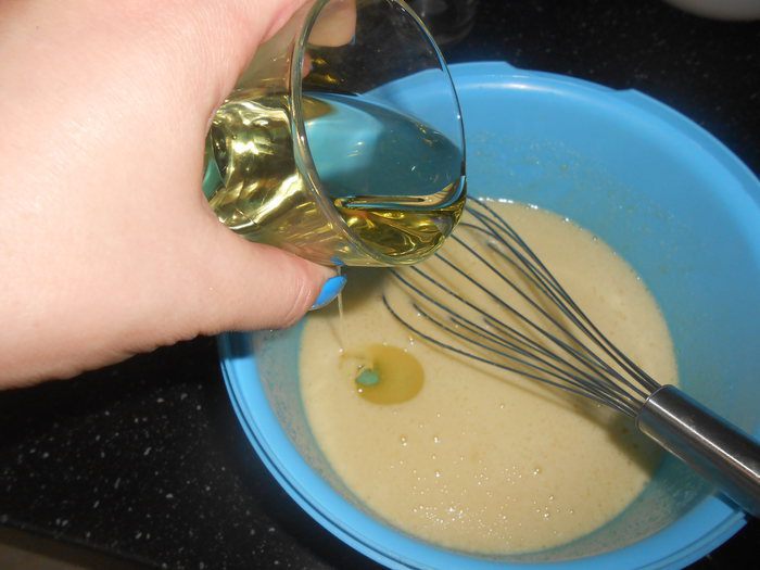 Вливаем тонкой струйкой 100 мl масло, не останавливаемся, взбиваем.