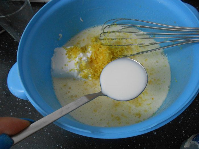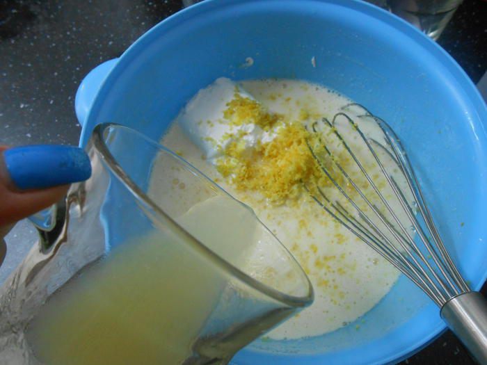 Добавляем сметану, тертую цедру с 2-х лимонов и молоко, перемешиваем.