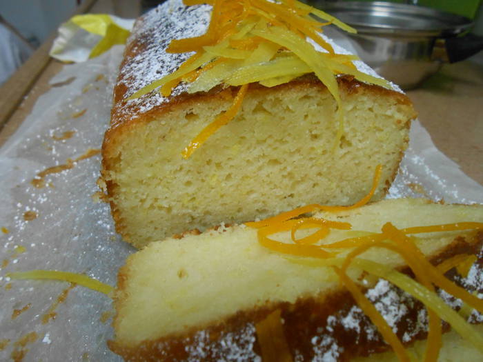 Остывший пирог украшаем сахарной пудрой и цедрой проварившейся в сиропе.