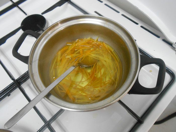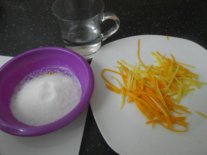 Для этого нужно: вода, сахар-80г, апельсиновая цедра 1-го апельсина, лимонная цедра 1-го лимона.