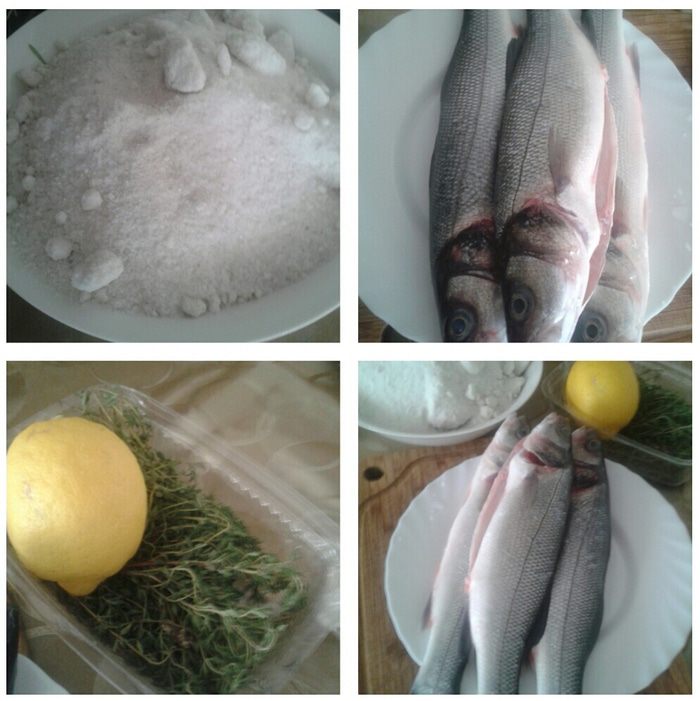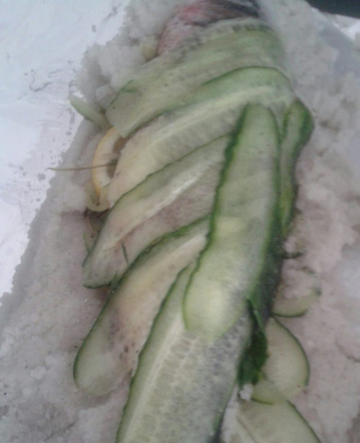 В соль вылить три ложки воды, соль должна быть как кашица. У меня сибас был маленький - 350 г, я побоялась такого количества соли, и поэтому обернула его тонким слоем огурца. Соли было достаточно. Может эта процедура была лишней, но результатом я была довольна.