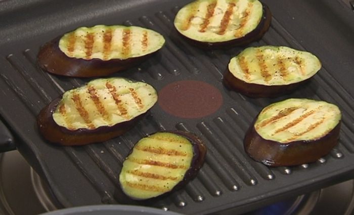 Разогреть сковороду-гриль и обжарить ломтики баклажана с двух сторон.