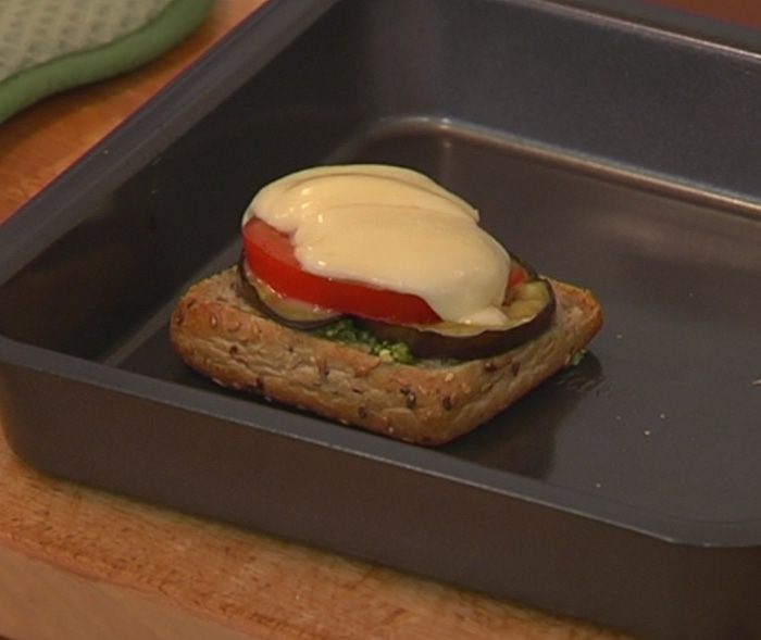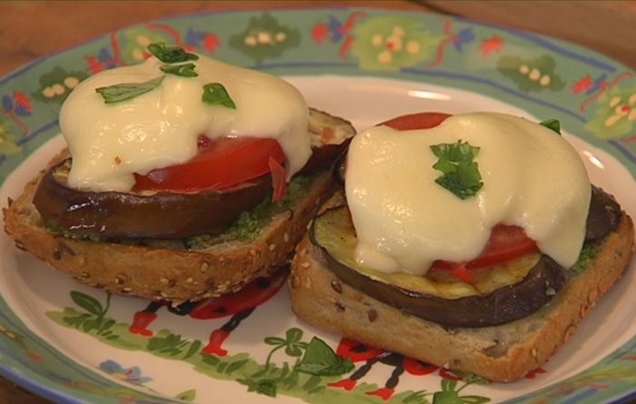 Поджаренный хлеб выложить в глубокий противень, смазать соусом песто, сверху разложить баклажаны, помидоры и моцареллу и отправить под гриль на 3 минуты.