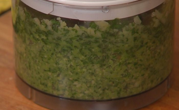 Приготовить соус песто: листья базилика, натертый пармезан и оливковое масло Extra Virgin взбить в блендере, затем добавить кедровые орехи, чеснок и взбить еще немного.