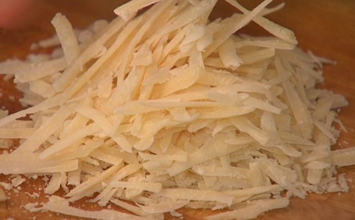 Пармезан натереть на крупной терке.