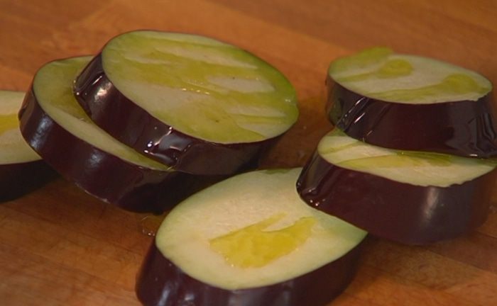 Баклажан нарезать кружками толщиной в 1 см, смазать их со всех сторон оливковым маслом, посолить и поперчить.