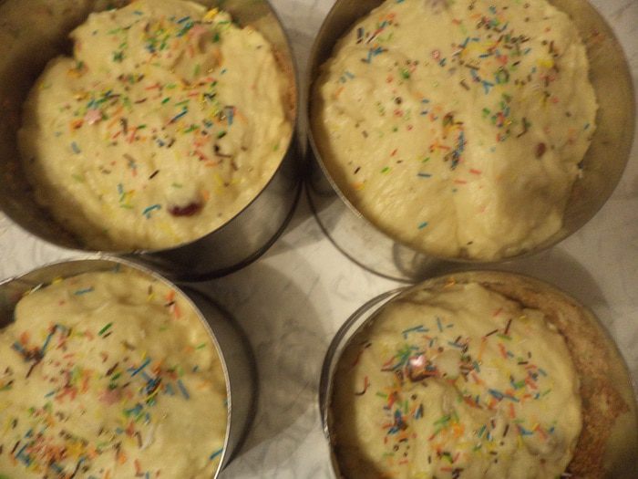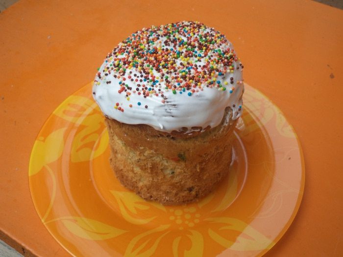 Куличи вынуть из форм, охладить. При помощи кисточки смазать глазурью, украсить разноцветной посыпкой.