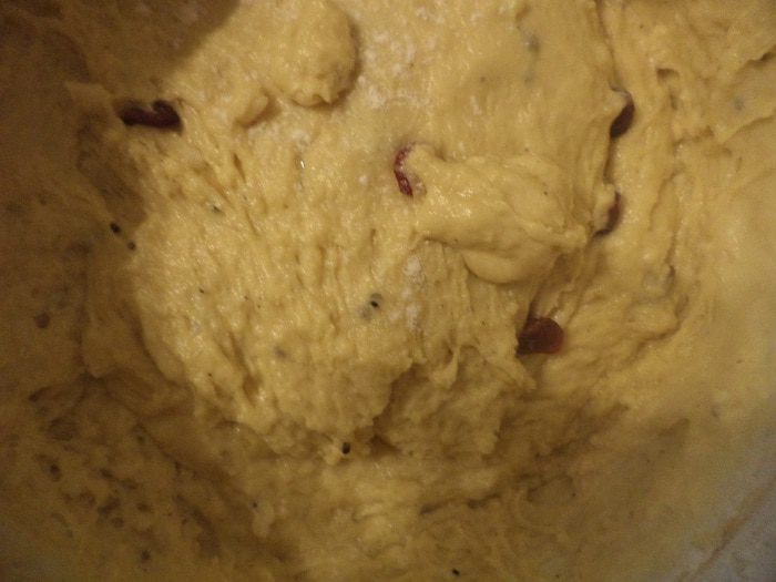 Добавить в тесто распаренную вяленую вишню, предварительно обваляв её в муке. Дать тесту подойти ещё раз.