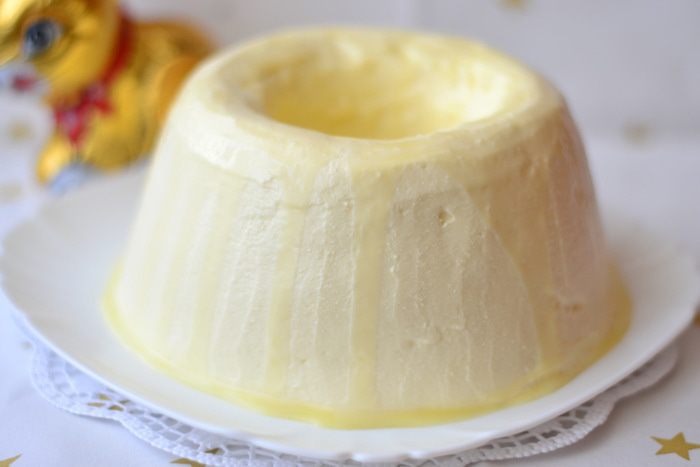 На следующий день взять глубокую миску, залить горячей водой и форму с пасхой отправить в горячую воду, подождать несколько минут. Положить на форму тарелку, аккуратно перевернуть и вынуть пасху. Так как Пасха очень нежная,узоры получились не четкими,поэтому я ее просто выровняла ножом.