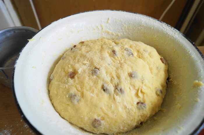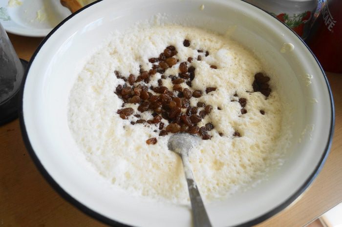 Добавить, замоченный в горячей воде, изюм и перемешать.