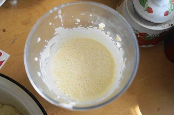 Молоко нагреть до комнатной температуры. В миске смешать молоко, раскрошенные дрожжи, 1 ст.л. сахара и 120 г муки. Накрыть миску полотенцем и поставить в теплое место минут на 30.