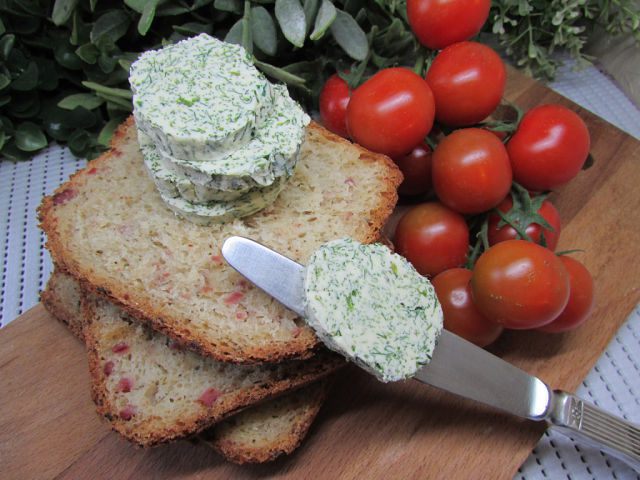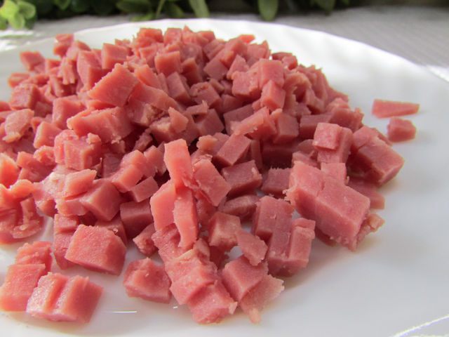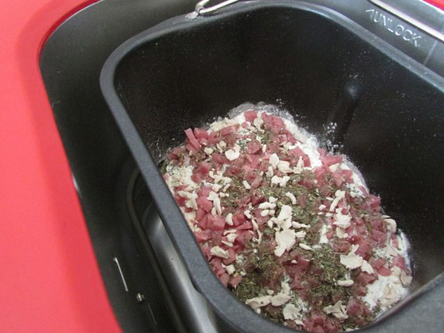 Поместите ингредиенты в хлебопечь в следующей последовательности: вода, масло оливковое, соль, сахар, мука, молоко сухое, ветчина, дрожжи. Базилик положите в диспенсер или засыпьте потом, по сигналу в контейнер. Включите хлебопечку (программа “Французский хлеб”), для размера 750 г, корочка средняя).