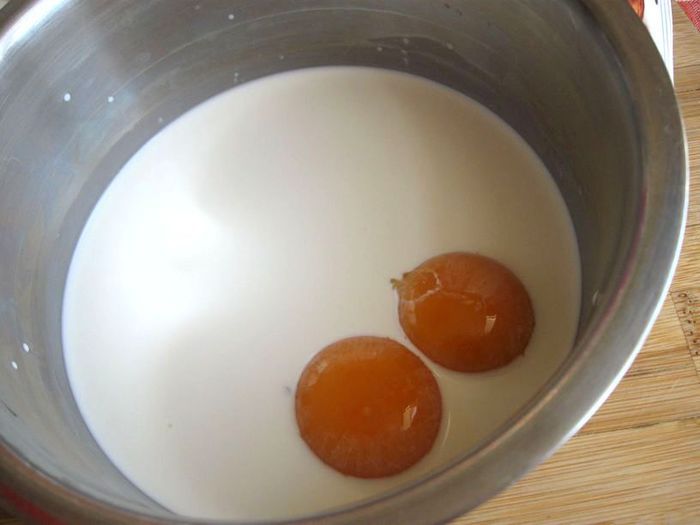 Желтки отделить от белков. Белки не понадобятся. Часть сливок налить в небольшую миску, добавить желтки, перемешать.