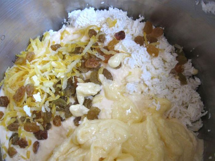 В протертый творог добавить загустевшие сливки, масло с сахаром, изюм, лимонную цедру, натертую на терке, и ванильный сахар.