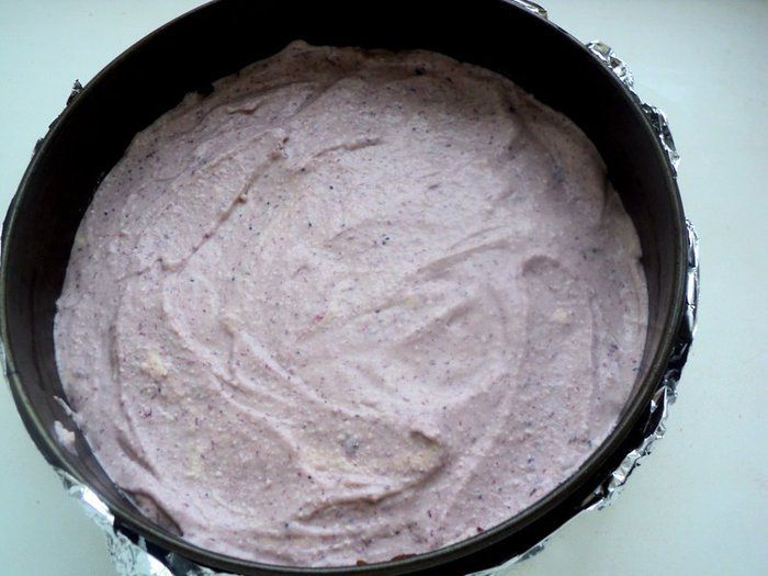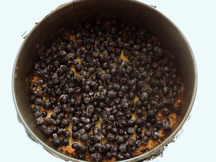 Форму с основой обернуть фольгой. На основу из печенья высыпать замороженную чернику.