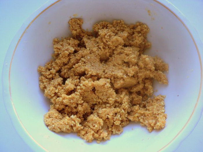 Добавить к крошке размягченное сливочное масло и перемешать.