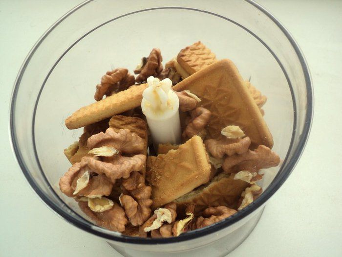 Печенье поломать на кусочки, положить в блендер. Добавить орехи и смолоть в крошку.