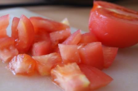 На помидоре сделать крестовой надрез, обдать кипчтком, снять кожицу. Порезать кусочками.