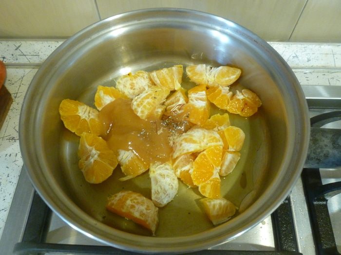 Мандарины очистить, нарезать на 4 части, сложить в сотейник с остальными ингредиентами для соуса. Проварить 15 минут до загустения.