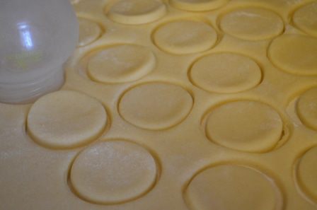 Тесто переложить на стол, присыпанный мукой и раскатать. Вырезать с помощью стакана кружки, диаметром около 5 см.