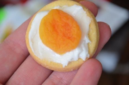 На печенье наносим глазурь, а сверху кладем одну курагу, которую я заранее залила кипятком и дала ей распарится. Потом обсушила и только тогда выкладывала на печеньку. )