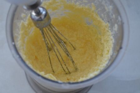 Мягкое масло взбить с сахаром добела, добавить молоко, яйцо и еще раз взбить.