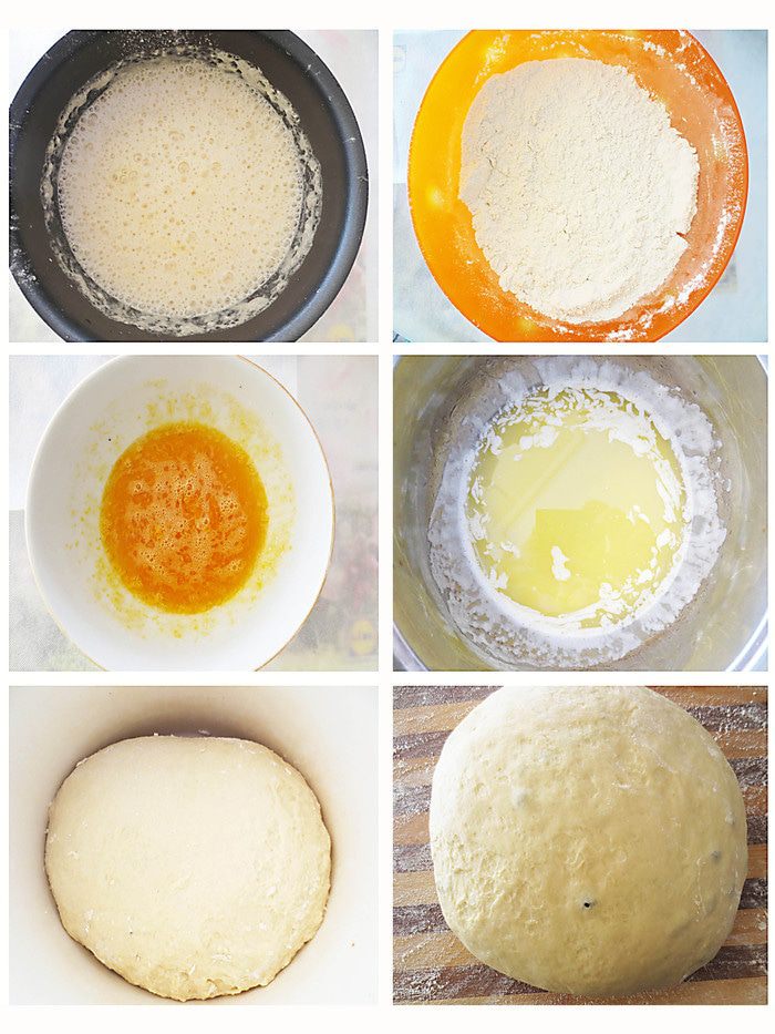 Постепенно всыпать в опару муку, яйца с сахаром, перемешать и добавить изюм. В конце добавить масло и замесить тесто. Тесто не должно прилипать к рукам. Накрыть тесто влажным полотенцем и оставить на пару часов, оно должно увеличиться в 2 раза.