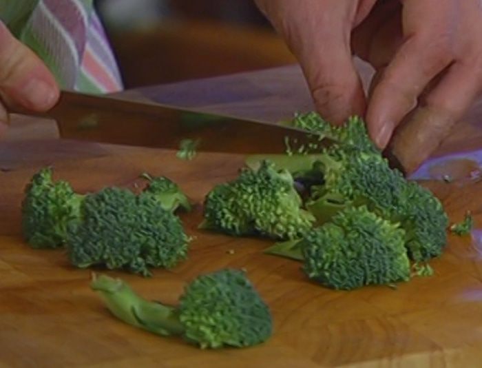 Брокколи разобрать на соцветия и разрезать каждое соцветие вдоль на 2–3 части.
