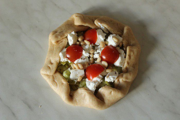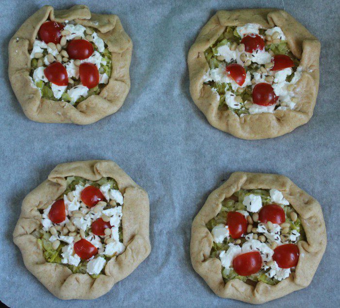 Мини-галеты из цельнозерновой муки с луком-пореем, козьим сыром и кедровыми орехами