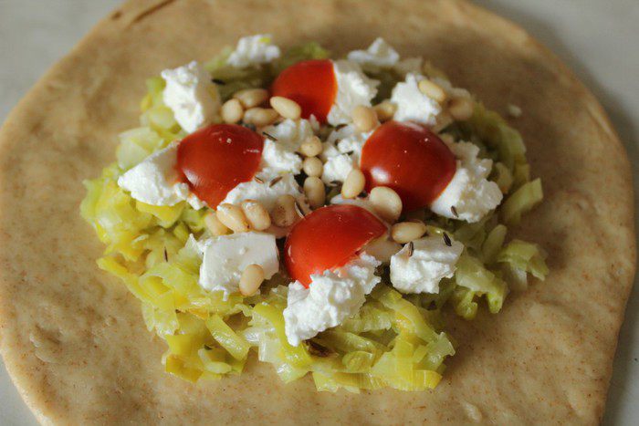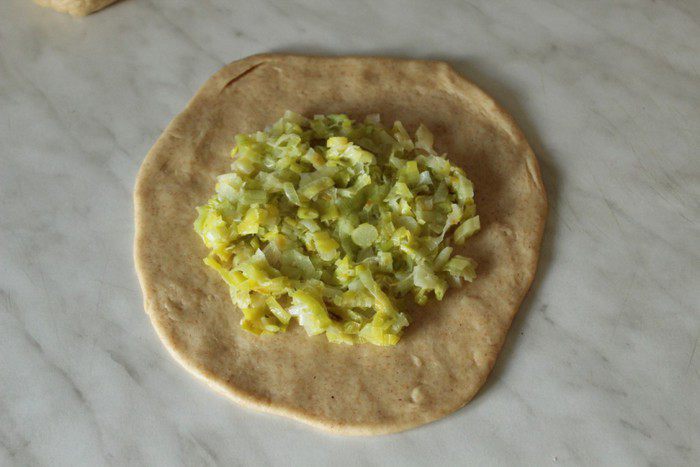 На раскатанную лепешку выложить слегка обжаренный порей.