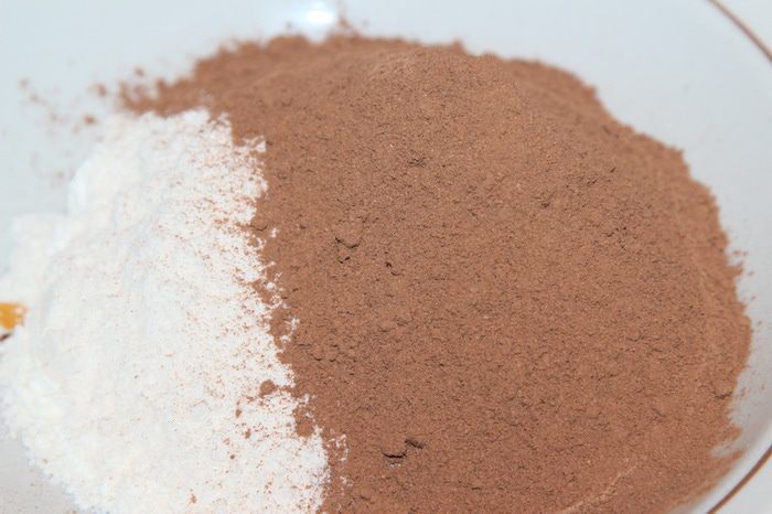 Смешиваем муку, какао и разрыхлитель (пекарский порошок).