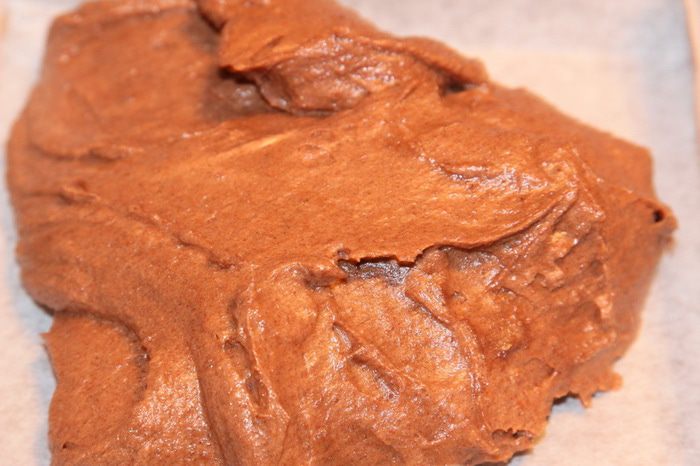 Снова все перемешали. Берем противень 20 х 20 см, выстилаем пекарской бумагой, духовку прогреваем до 160 градусов (каждый свою духовку знает хорошо - ориентируйтесь). Выкладываем тесто в противень и распределяем равномерно.