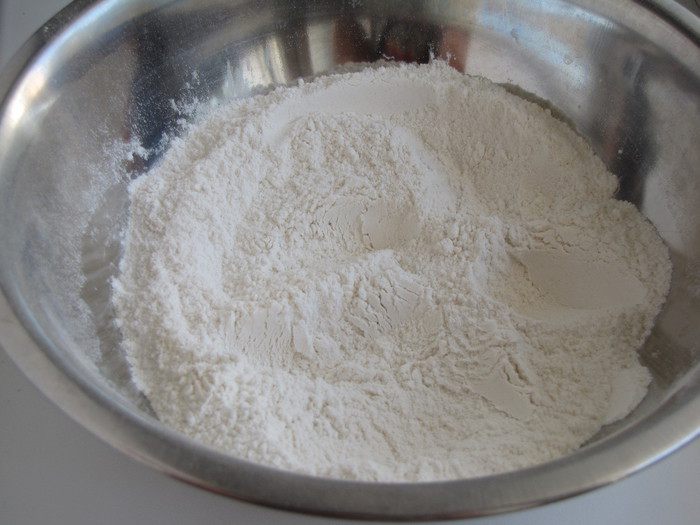 В миску просеять муку, соль и разрыхлитель. Перемешать.