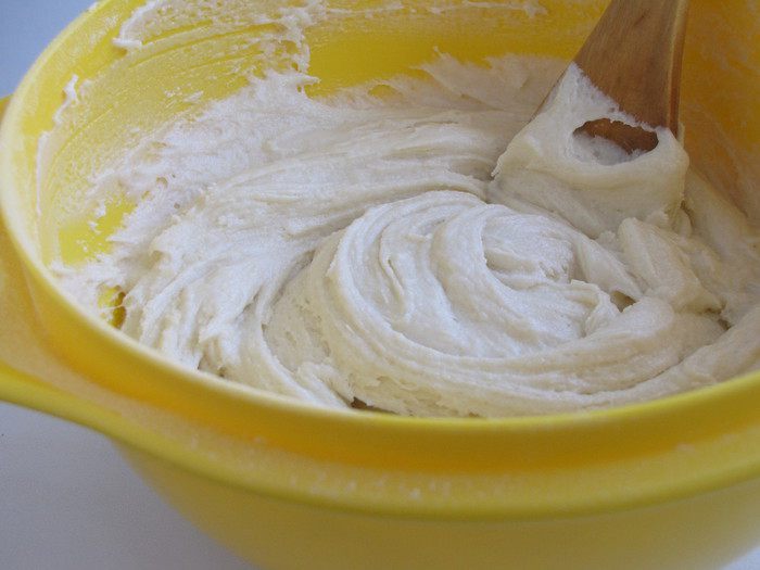 Постепенно всыпать муку в масляно-яичную смесь, чередуя со сметаной. Замесить тесто.