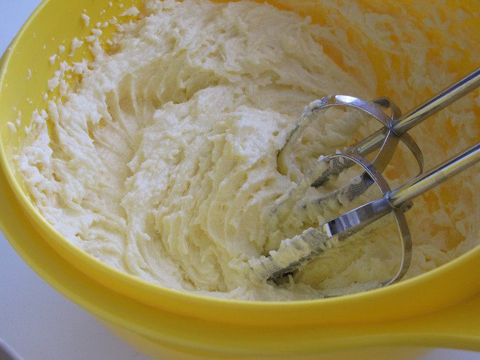 Понадобится стакан 200 мл. Размягченное сливочное масло взбить с двумя видами сахара и яйцом до воздушной массы. Я для себя немного уменьшила количество сахара.