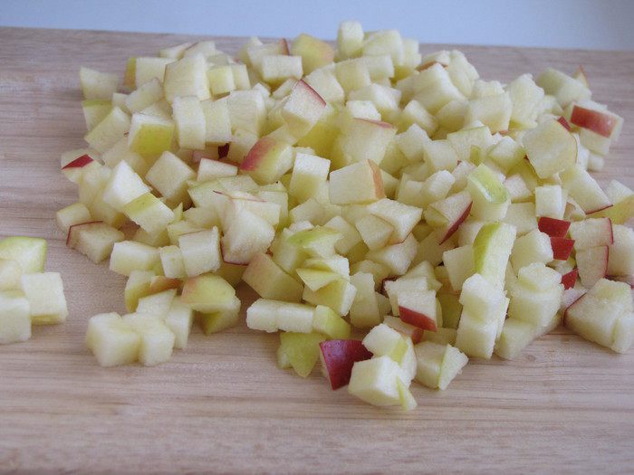У яблока удалить сердцевину и нарезать кубиком со стороной 0,5 см. При желании яблоко можно очистить.