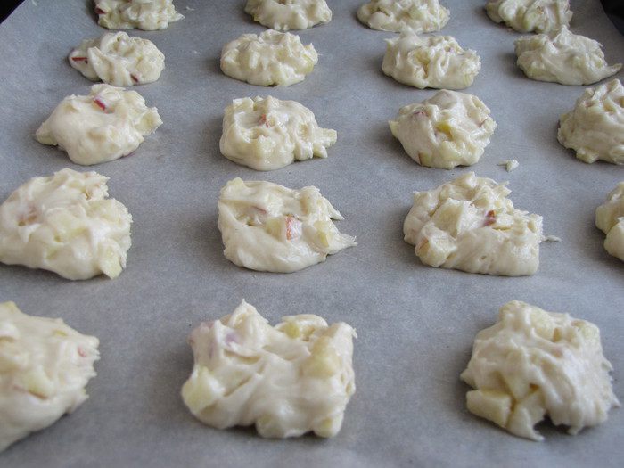 На противень, застеленный пергаментом, выкладывать тесто чайной ложечкой. Кучки теста располагать на расстоянии друг от друга, т. к. печенья расплывутся. Выпекать 12-15 минут при 200 град.
