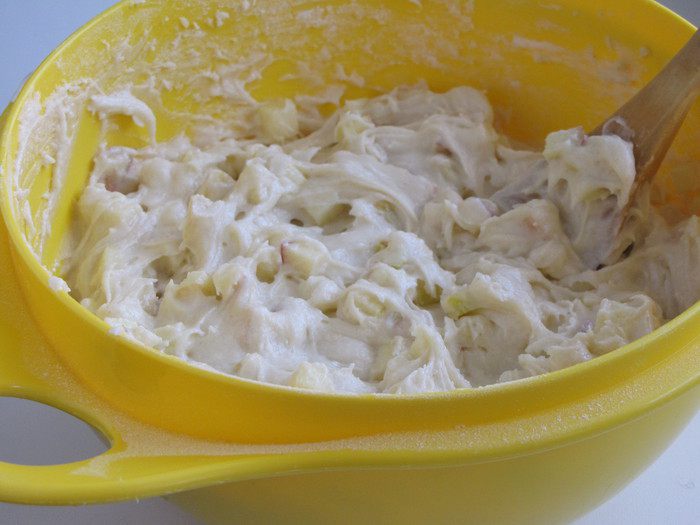 В тесто всыпать яблочные кубики и изюм, осторожно перемешать деревянной лопаткой. Изюм использовать по желанию. Я не добавляла.