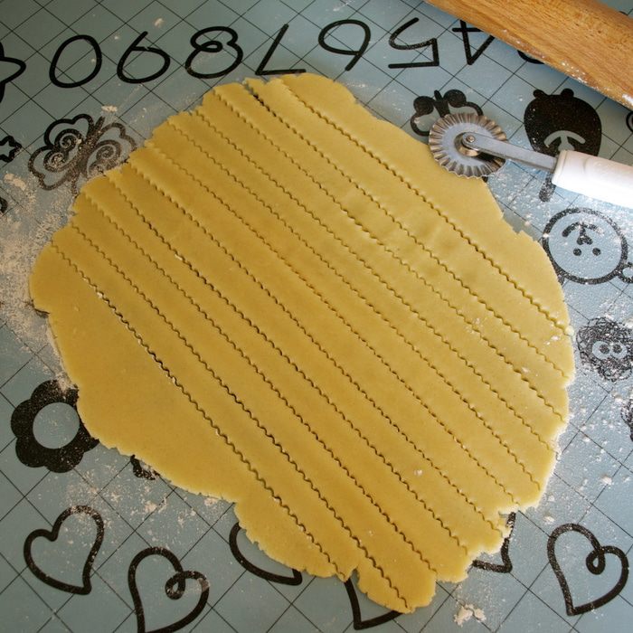 Остатки теста собрать, раскатать из него еще один пласт и нарезать полоски с помощью рельефного ножа...