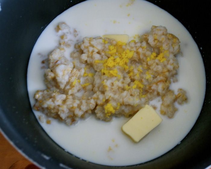 В кастрюльку положить молоко, сливочное масло и вареную пшеницу. Добавить цедру одного лимона. Поставить все на слабый огонь и варить, время от времени помешивая, до загустения...