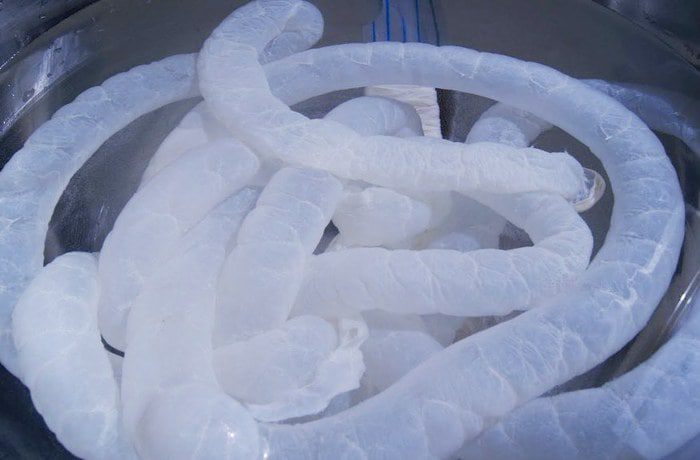 Подготовленные кишки продаются во всех супермаркетах. Наполняем кишки водой и оставляем на некоторое время растянуться.