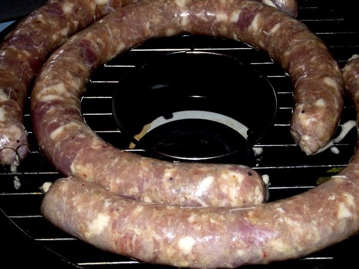 Отправляем колбаску на сковороду газ-гриль и обжариваем на среднем огне по 15 минут с каждой стороны. Готовность проверяем зубочисткой — если прозрачный сок, значит колбаска готова. В духовке колбаску жарим от 45 минут до 1 часа при 200 градусах в зависимости от размера колбаски. На нижний уровень в духовку ставим глубокую миску или противень с водой, а колбасу на среднюю решётку. Это секрет запекания в духовке — колбаса не высыхает и остаётся сочной.