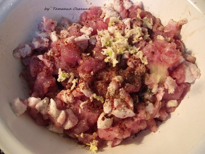 Затем меньше половины мяса оставляем для начинки, а большую часть пропускаем на мясорубке вместе с салом. Оставшееся мясо добавляем в фарш и хорошо перемешаем начинку. Можно попробовать на наличие соли и добавить еще, если вам показалось количество недостаточным.