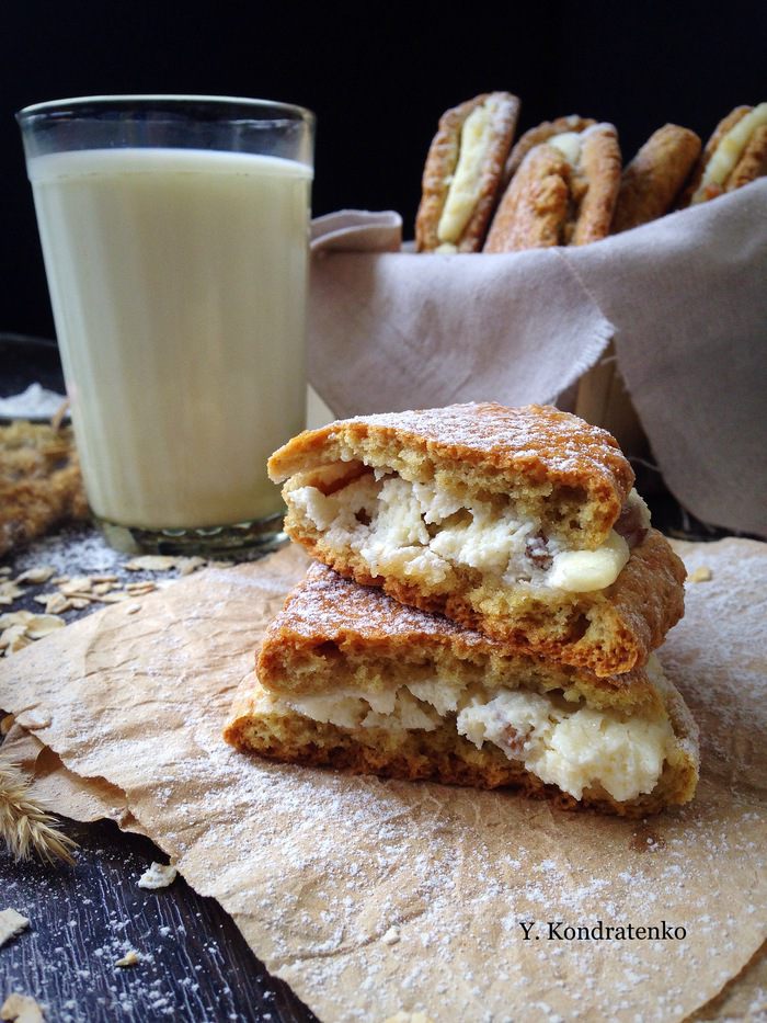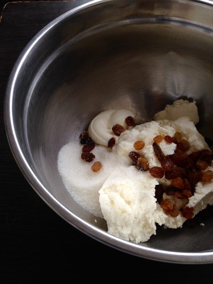 Для начинки: смешать творог, сахар, цедру лимона и сметану, чтобы получилась гладкая творожная паста. Добавить горсть изюма.