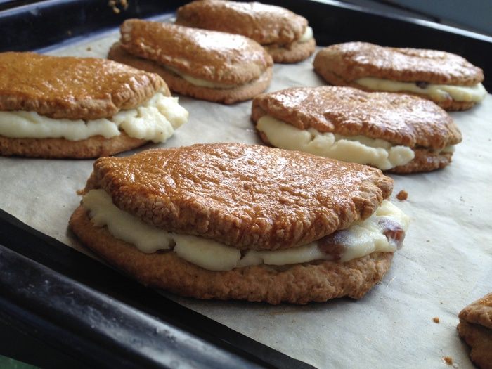 Выложить его на присыпанный мукой стол, аккуратно скатать в цилиндр и разрезать на 10-15 частей. Каждый кусок размять пальцами в лепёшку толщиной 5 мм, положить начинку ближе к верхнему краю.